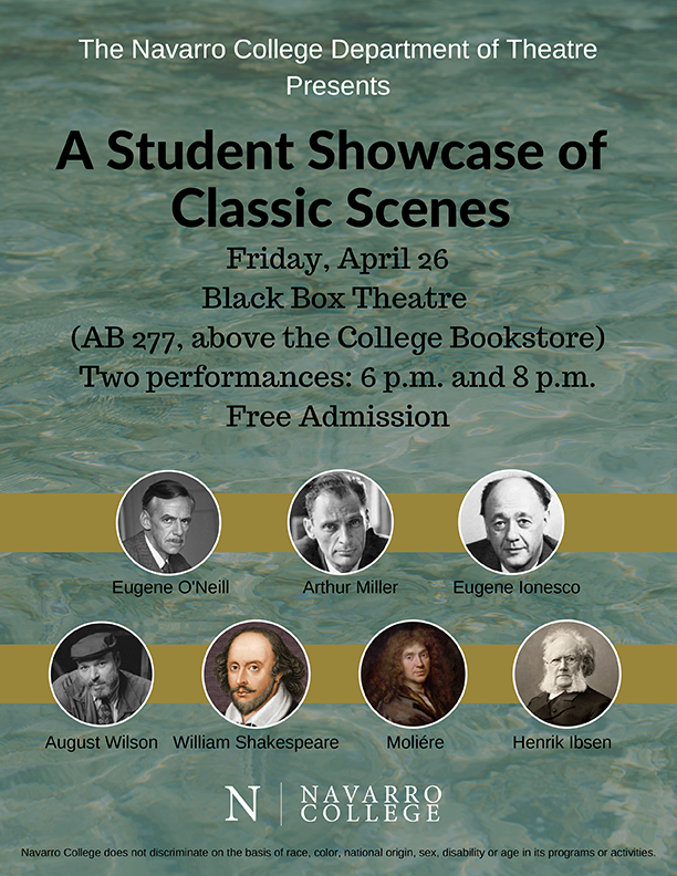 The 皇冠博彩 Department of Theatre invites you to see the Spring 2019 performance by NC students: 学生展示经典场景 on Friday, April 26 in the Black Box Theatre on the Corsicana Campus. You have two chances to catch the show: 6 p.m. and 8 p.m.. 免费向公众开放。